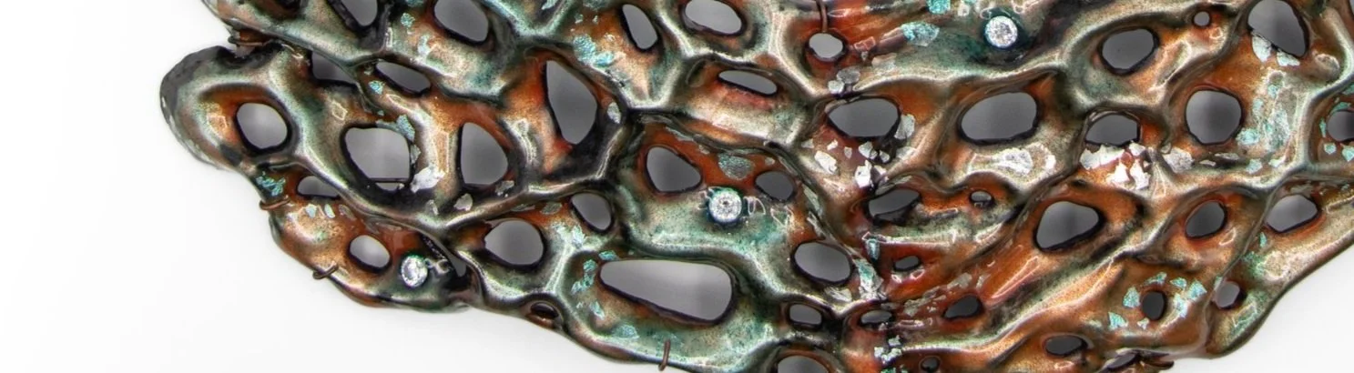 I draw inspiration from natural environments to create jewelry. Each piece is inspired by a particular environment, often a region of the ocean, and I use the colors, forms, and features of that environment. This imagery is translated through the process of making which may include hammer forming, enameling, patination and the use of textile techniques in metal. I incorporate a loose narrative that ties the jewelry together as a body of work and connects it to the environments that inspired it. The resulting wearables draw viewers into a greater appreciation for the beauty and wonder of the ocean.
